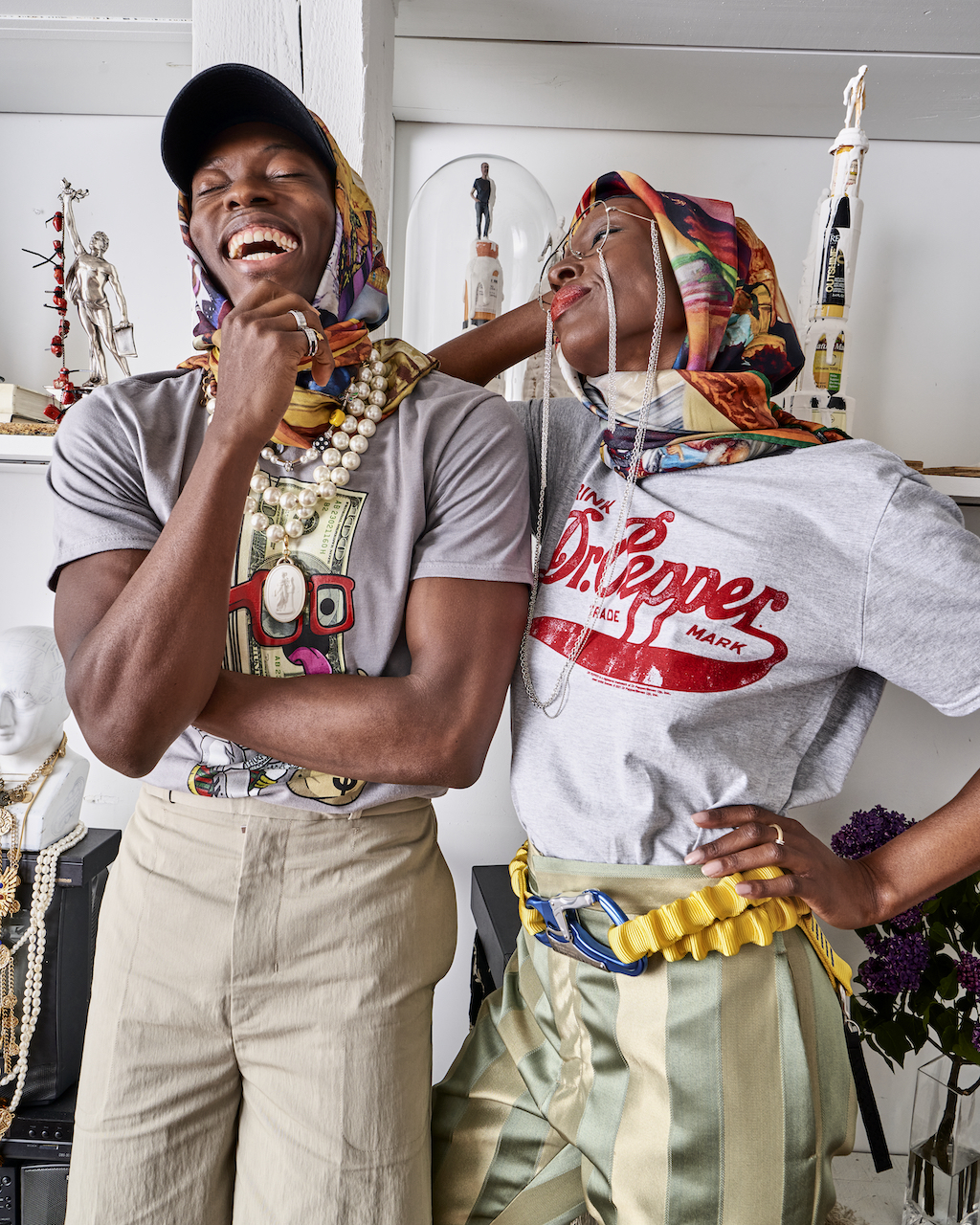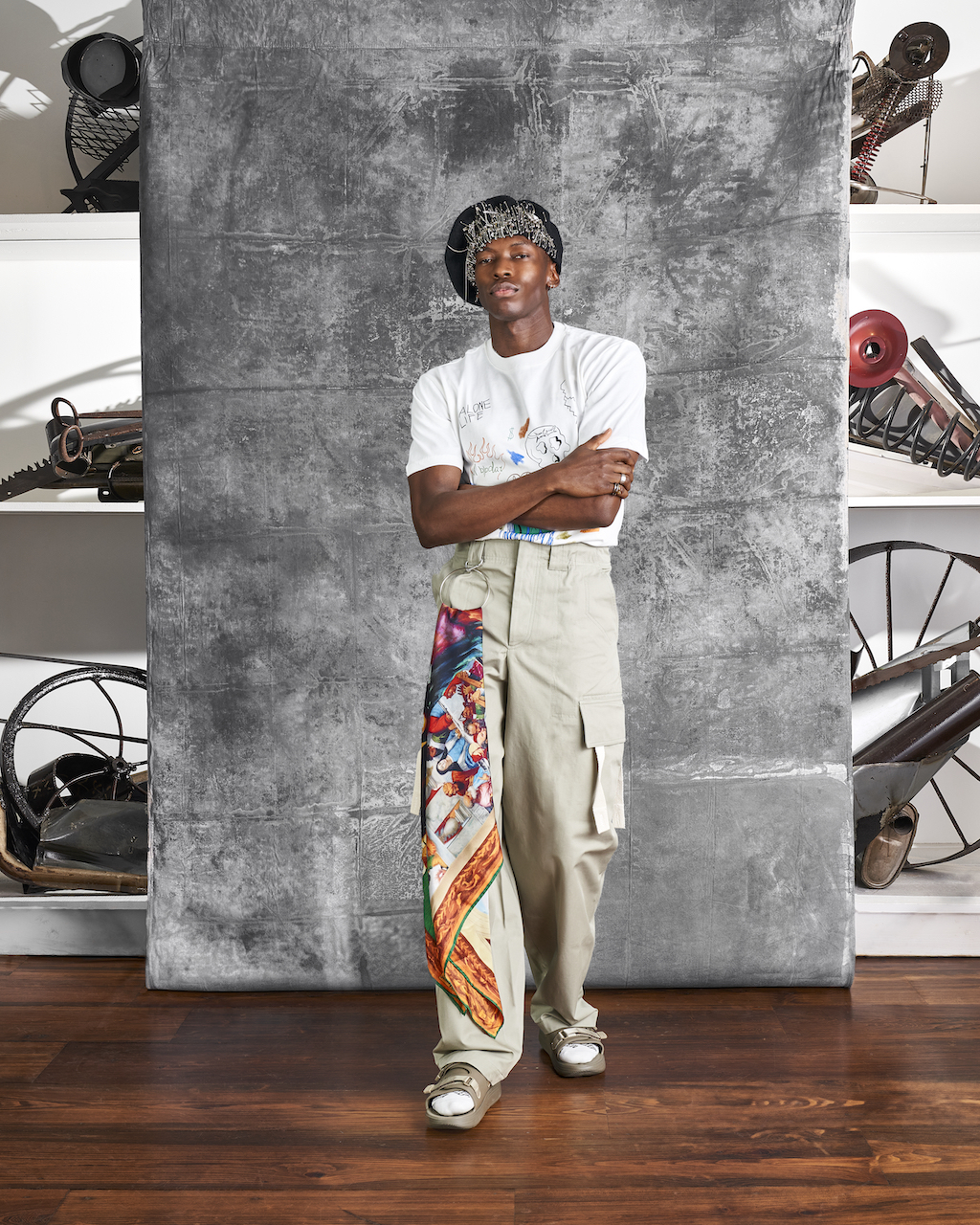 Also featured in the editorial is the fashion label Ikire Jones, by designers Wale Oyejide and Sam Hubler. They use fashion as a vehicle for storytelling and to change perceptions about marginalized populations, immigrants, refugees, and migrants, all through the veil of clothing. Their apparel resonates beautifully with those who see themselves represented in it without being made for any particular gender or identification. With featured work in the films Black Panther and Coming to America 2, the brand’s charge is to use the spotlight to further its cultural mission.