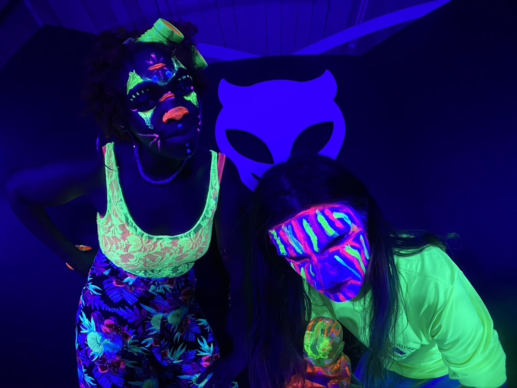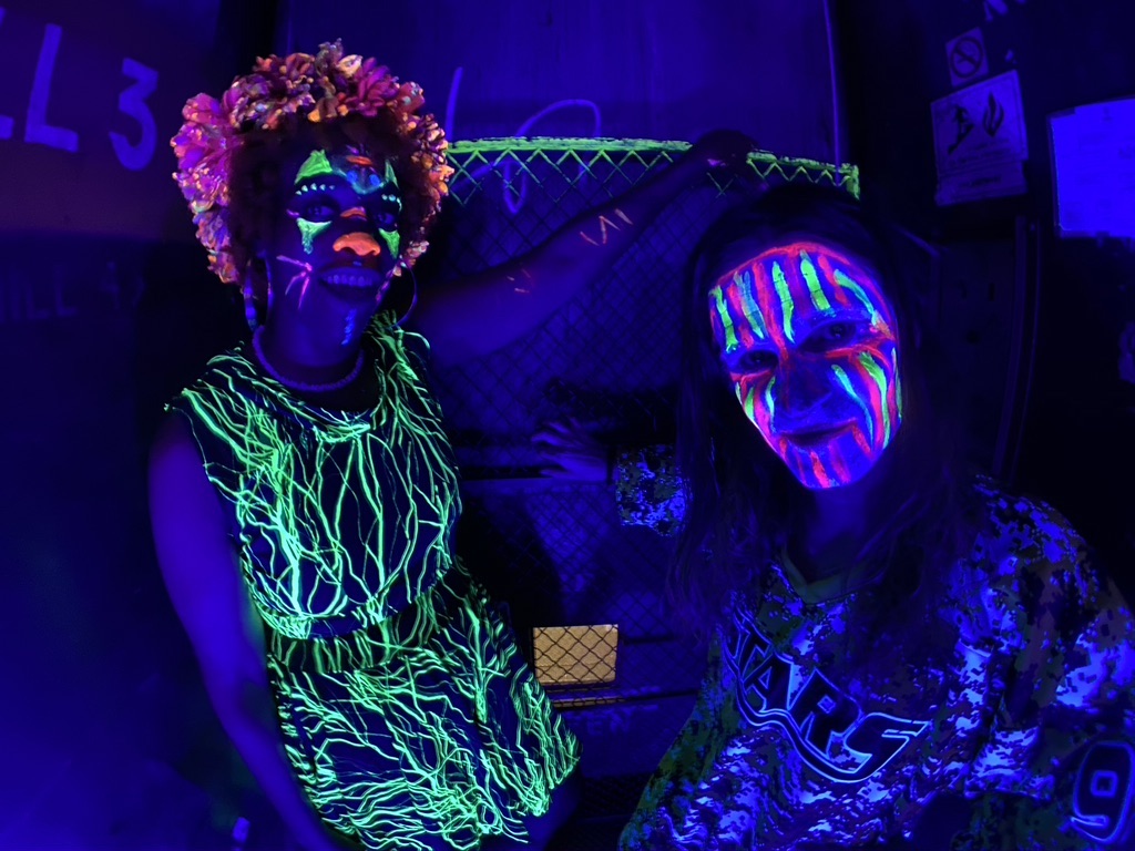 Symphony: When we were preparing for our first show, the vision was really to make it as fun as possible. Like our set is like a funhouse. We change the whole scene, get messy, freak people out. And the black lights are an important aspect of that. It sort of sets an intention for the space. Like, “now for something completely different…” In that way it acts like a filter of sorts. We invite the no of the close-minded. They could just see us and know we’re not for them.