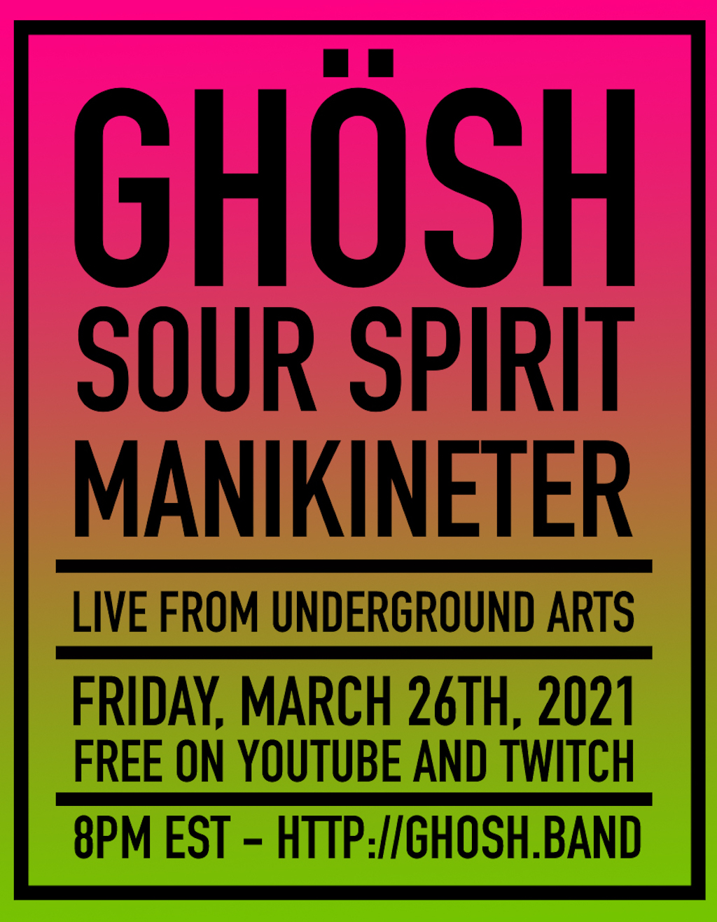 Ghösh is hosting a live stream concert from Underground Arts, Friday, March 26 with Sour Spirit and MANIK|NETER, free on Twitch and YouTube, with a black light Ghösh poster for gig available here… Act fast.