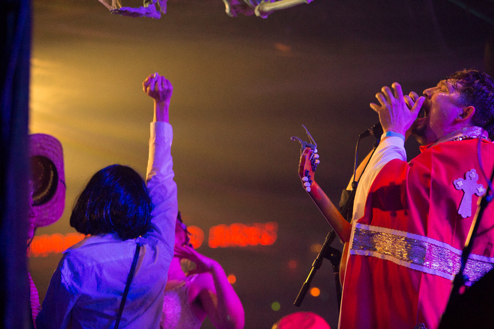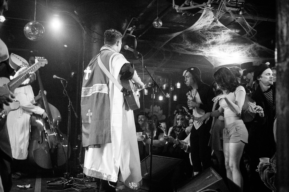 For the 10th anniversary of their version of the Halloween ball, the TJ crew – with rocking Ali Awan and Port Richmond’s Aerosmith cover giants, AEROMINGOSMITH featuring the wild vocal stylings of Ali Wadsworth as their guests – its 2019 iteration, at Johnny Brenda’s is part dress-up ball-turned-séance- turned gooey, messy bloodbath. (Think the bucket scene from Carrie with guys with beards) with a big hint of Rosemary’s Baby in the mix.