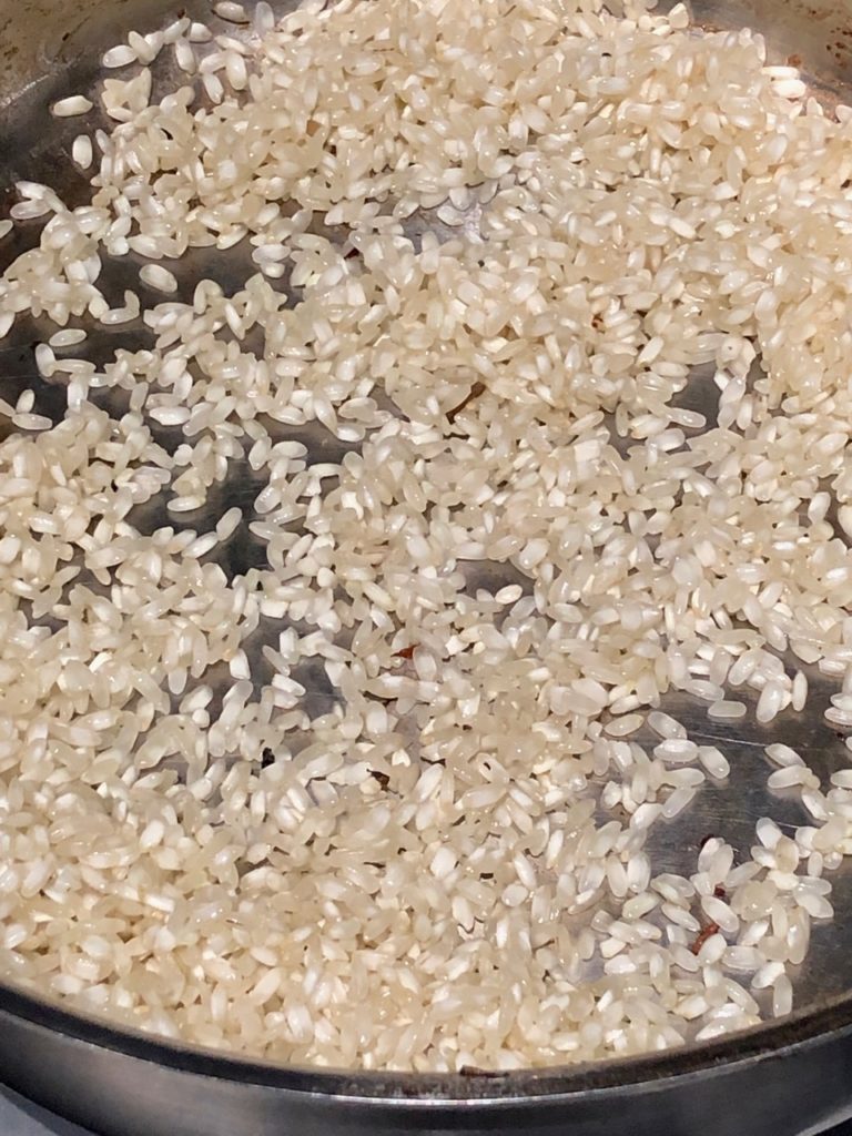 Wipe out the pan with a paper towel, heat the other TBS oil on the same medium heat, adding the rice and saute the rice grains, stirring constantly to coat each grain of rice with oil until they start to appear translucent a bit, and lose the chalky white color, for about 3 minutes.