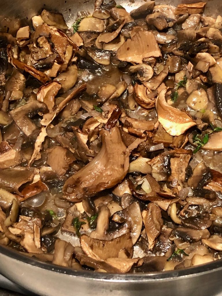 Add the button mushrooms and shallot sauteing for a few minutes until the vegetables start to wilt. Add the reserved porcini mushrooms (if using), thyme, salt and pepper to taste. Saute for another 3- 5 minutes, then transfer to a small bowl.