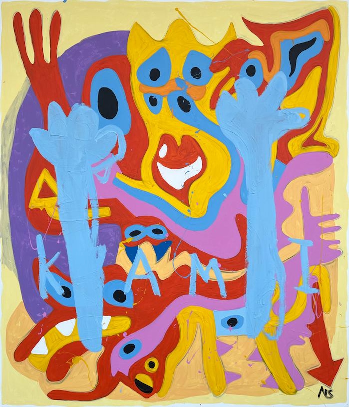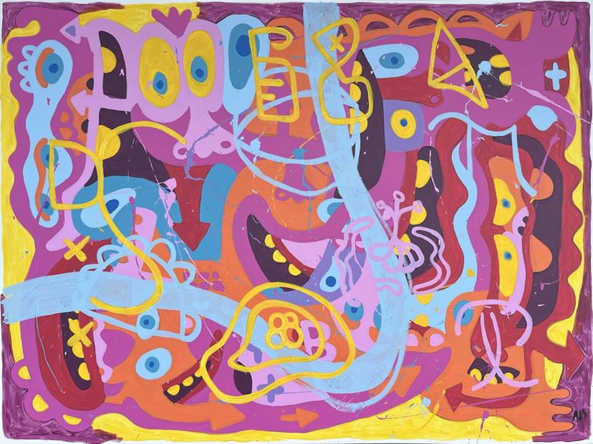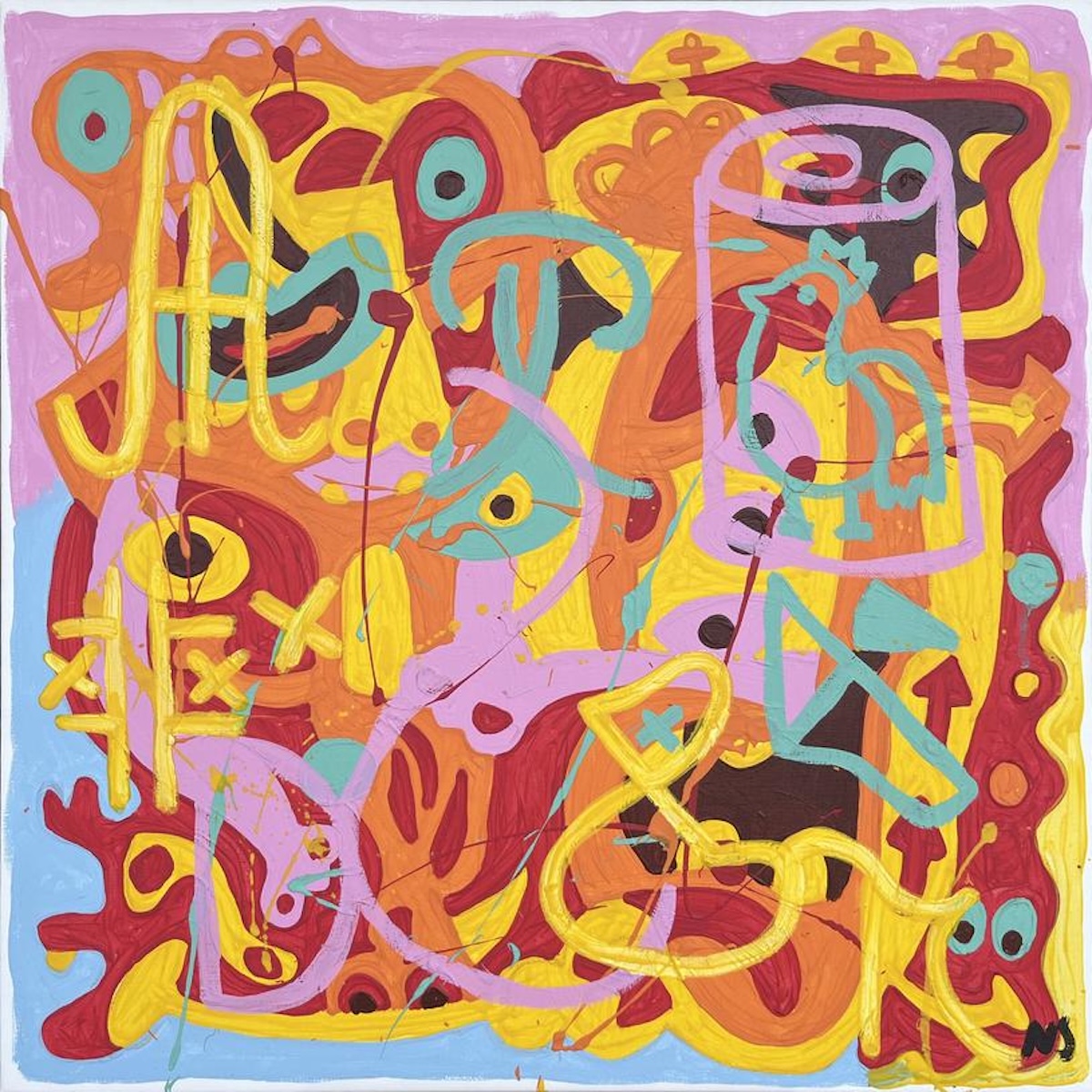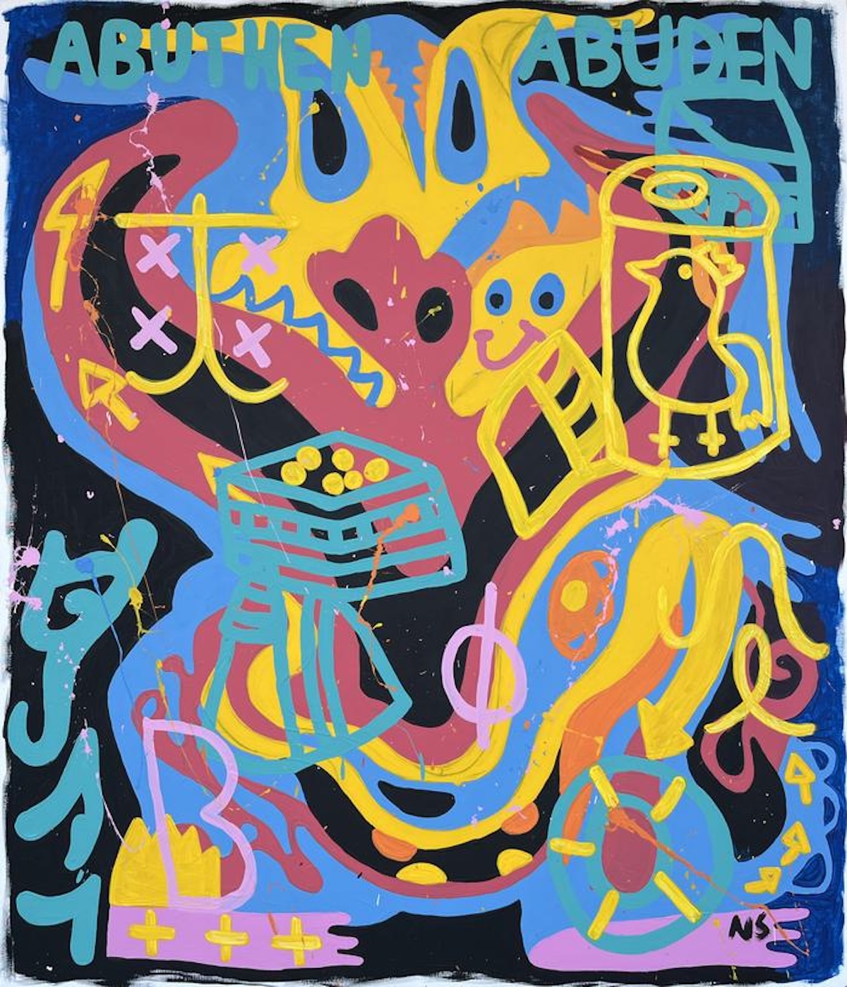 Raised on the punchy aesthetics of 1960s Pop and the gestural bravado of Abstract Expressionism, Nigel Sense gathers fragments of travel—street-market signage, overheard slang, a glimpse of neon across humid dusk—and lets them collide in paint. Drips run, lines misbehave, and typeface snippets fight for space, but the eye never feels crowded; instead, there is a lyrical rhythm to the chaos, a reminder that discovery is made in motion. Sense calls his roaming research trips “going fishing,” and you can trace every cast on the canvas: a hot-pink swipe echoes temple lanterns, while a chalky turquoise block seems to bottle the monsoon sky just before the downpour.