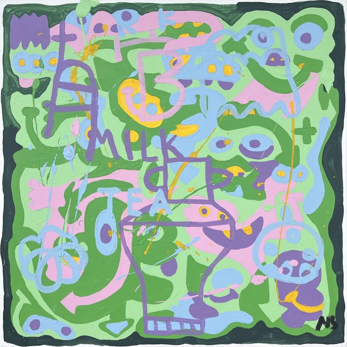 “Ice Milk Tea Time” 2024, acrylic on canvas, 21.65 x 21.65 inches (right)