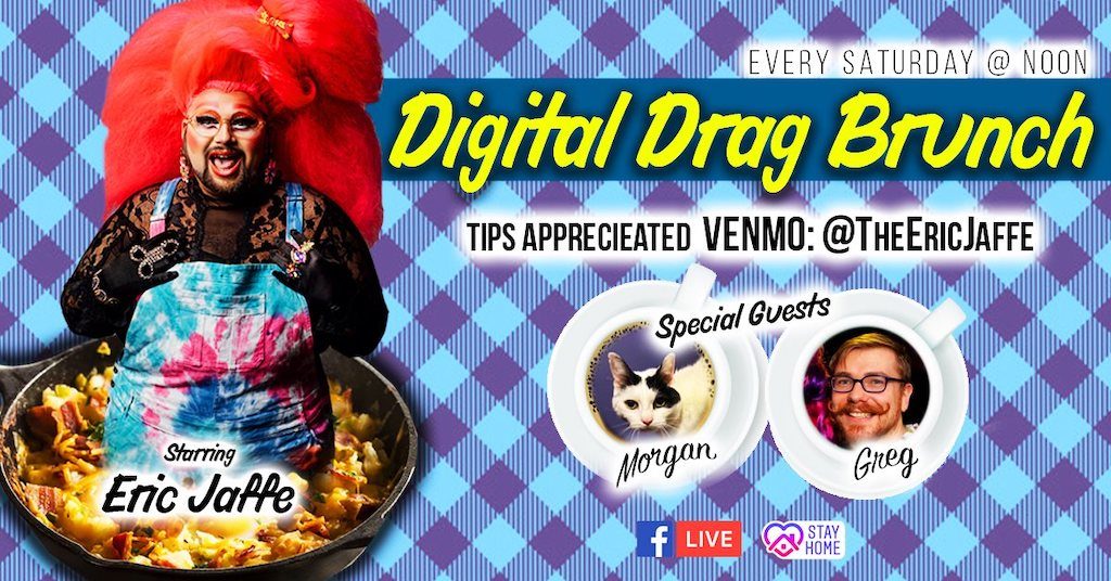 From their Daily Live Stream and Facebook Live Round-Ups compiled at the drop of a sequin – as well as Eric’s weekly Digital Drag Brunch, every Saturday at noon on Facebook Live – Jaffe is bringing the whole of the in-person, up-close and personal, nonbinary, live theatrical vibe of drag Philadelphia to your home in all its Technicolor, Cinemascopic fashion.