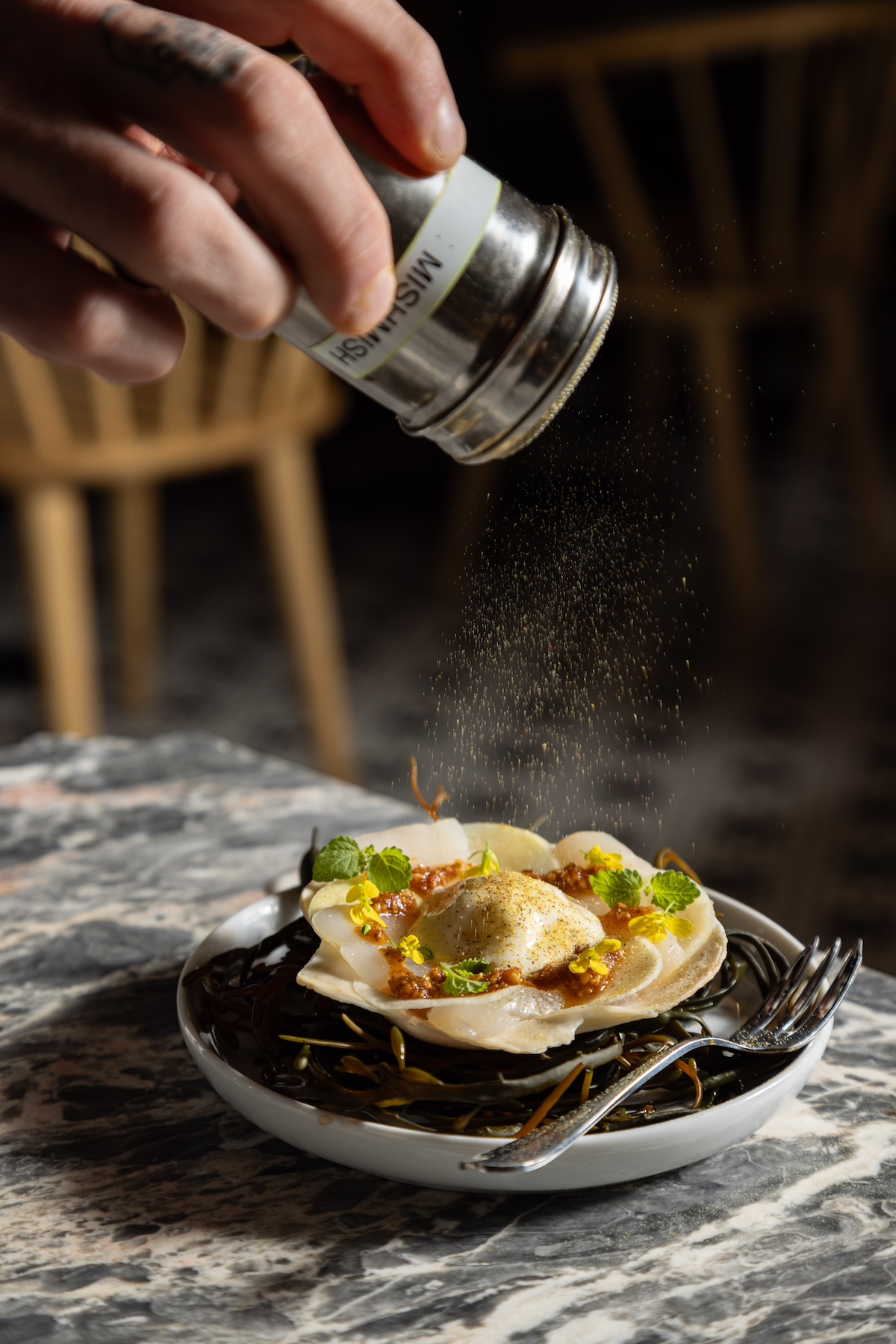 The Poulet À La Crème is a standout addition, an indulgent offering featuring black truffle-chicken leg pressé, king trumpet mushrooms, pearl onions, and celery root. Seafood aficionados can delight in the Hokkaido Scallop Crudo, where the freshness of the scallops is enhanced by a cider emulsion, hazelnut gremolata, kohlrabi, and finger limes, embodying the essence of the season’s produce.